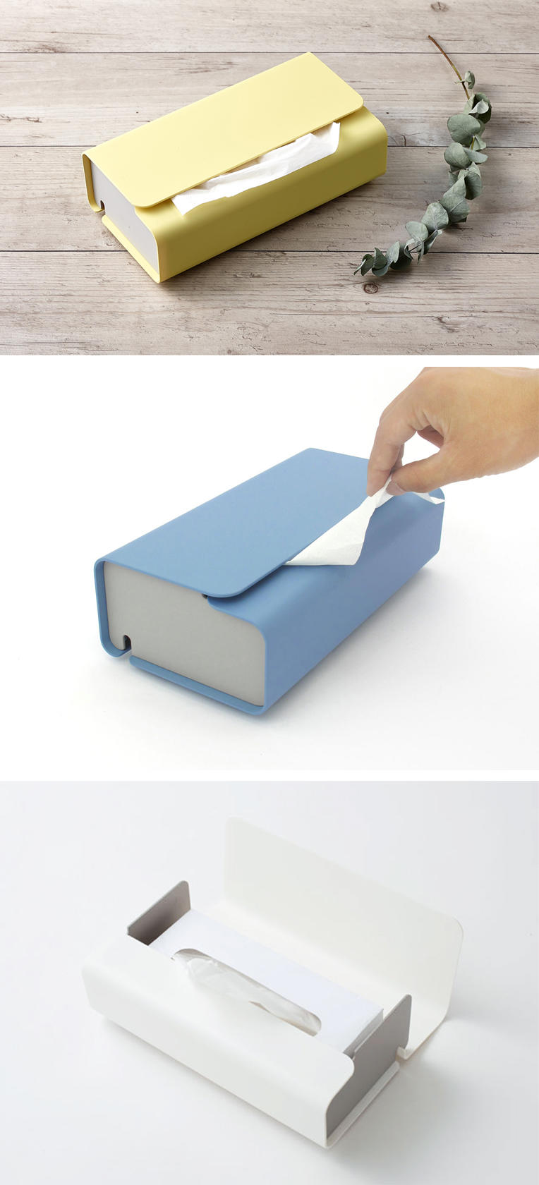 パオルは取り出し口のフラップがティッシュを覆い、露出を最小限に抑えてあるため、使わない間に付着する埃や花粉などを防ぐティッシュケースです。