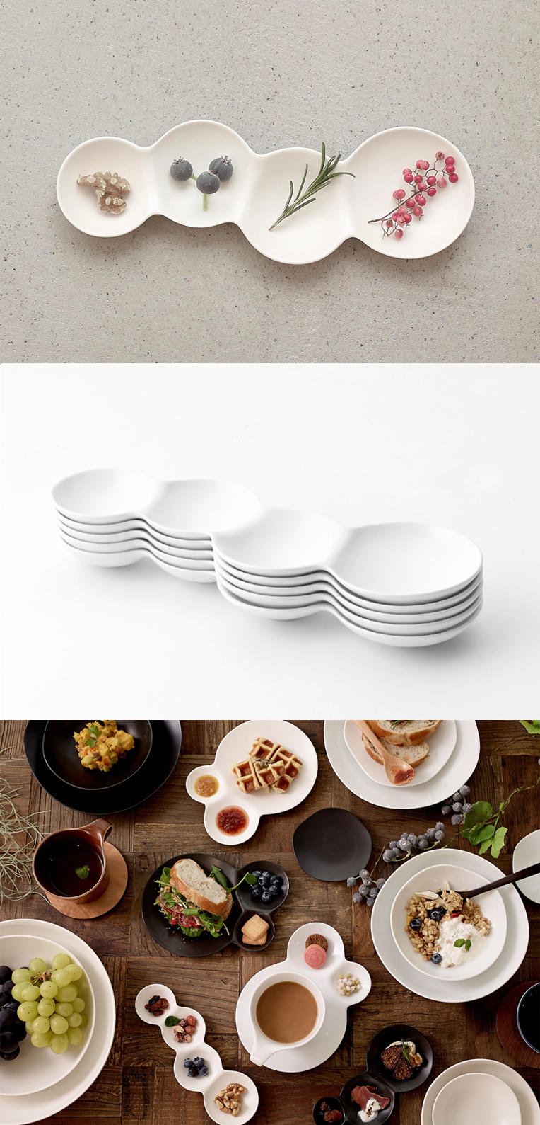 小さなお茶菓子や一品料理にぴったりの三連仕切り皿、薬味入れに人気の4連仕切り皿も合わせて三種類のカタチをご用意しました。